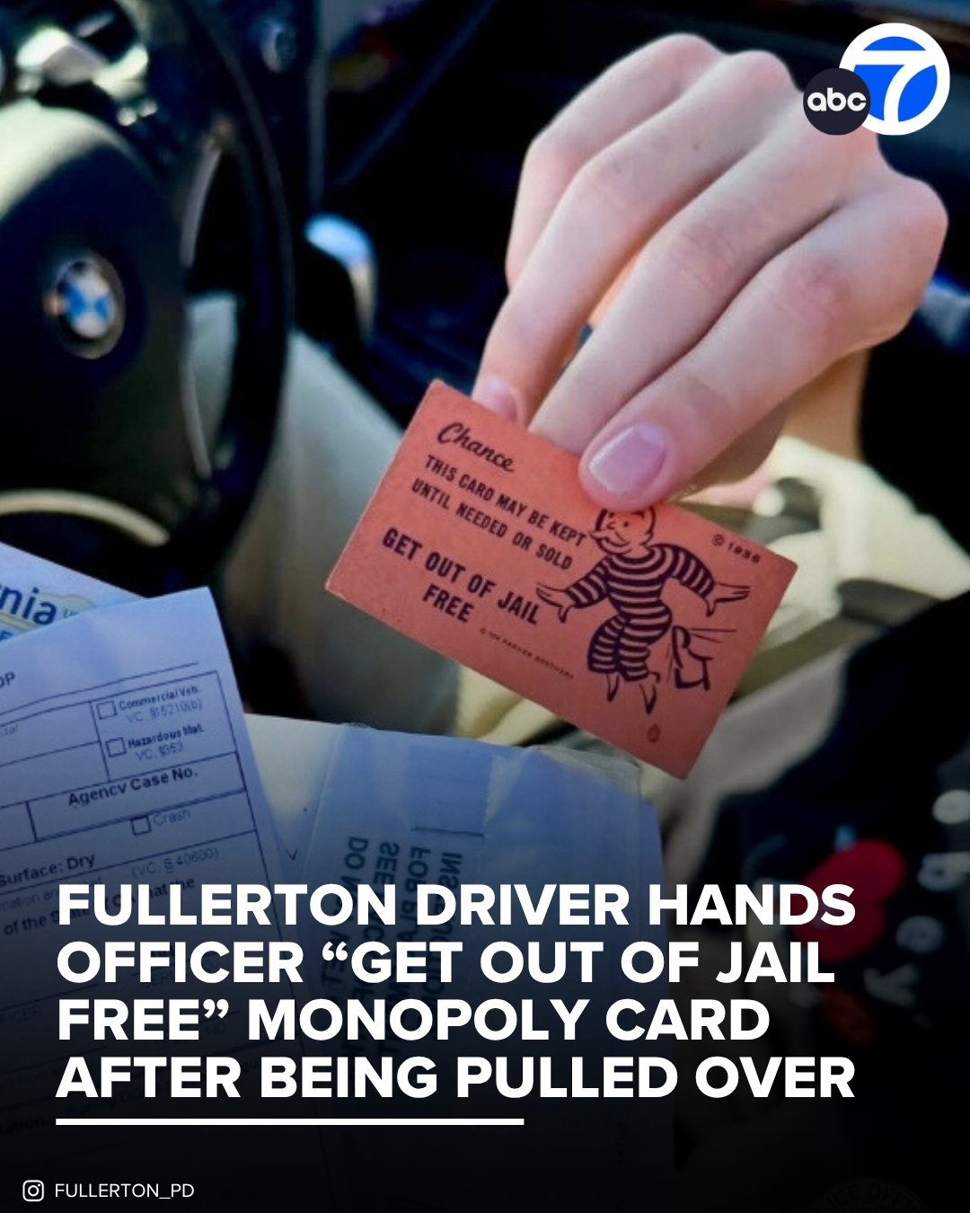 The driver handed over a Monopoly “Get Out of Jail Free” card after being pulled over for a traffic violation.