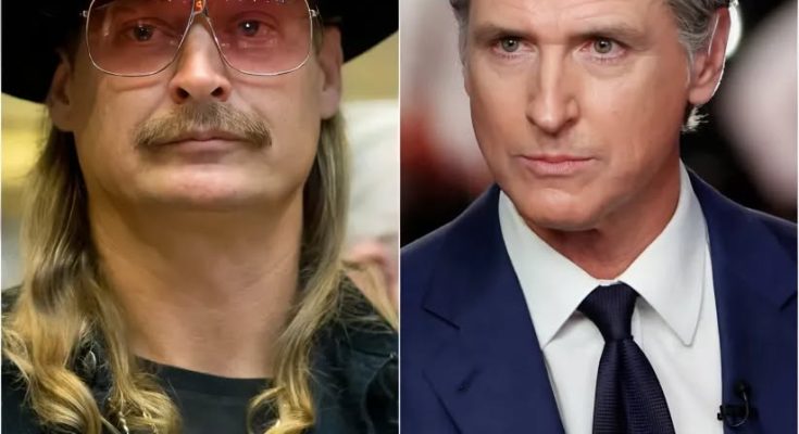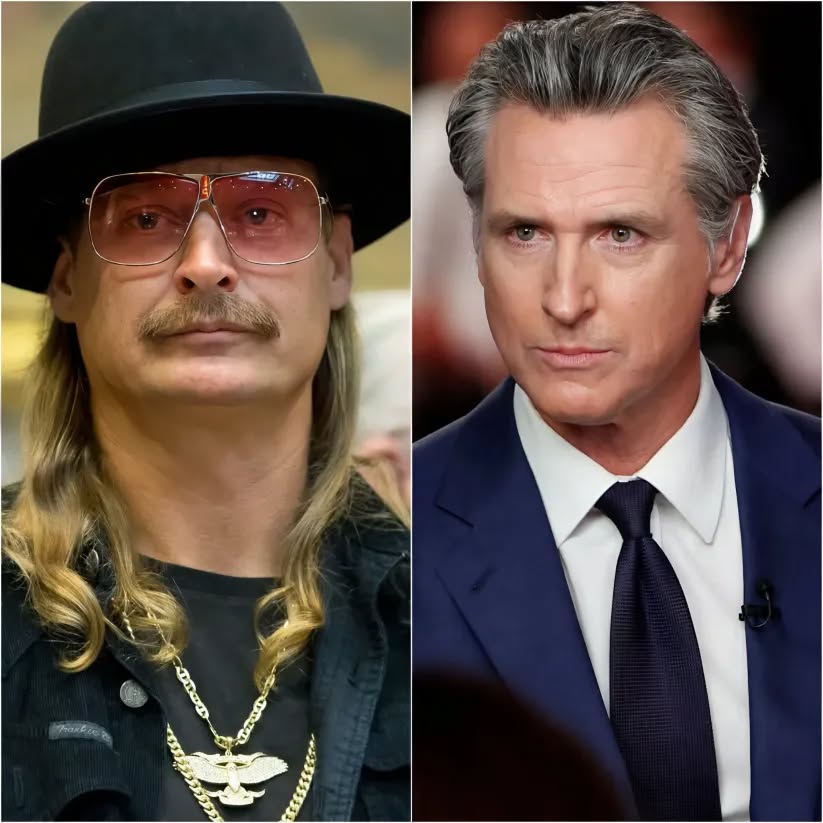The room, packed with journalists, aides, and environmental activists, fell silent. Newsom, mid-sentence about carbon credits, paused, glanced at the screen showing Kid Rock’s video, and without missing a beat, leaned into the microphone.