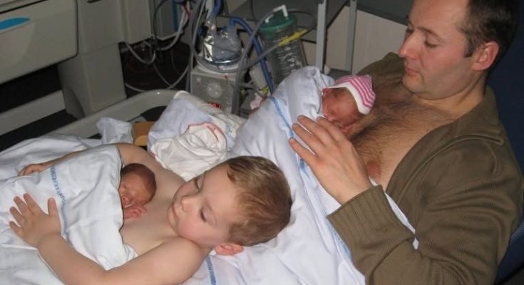 While one newborn rests on his father’s chest, the young boy cradles the second infant twin on his own.